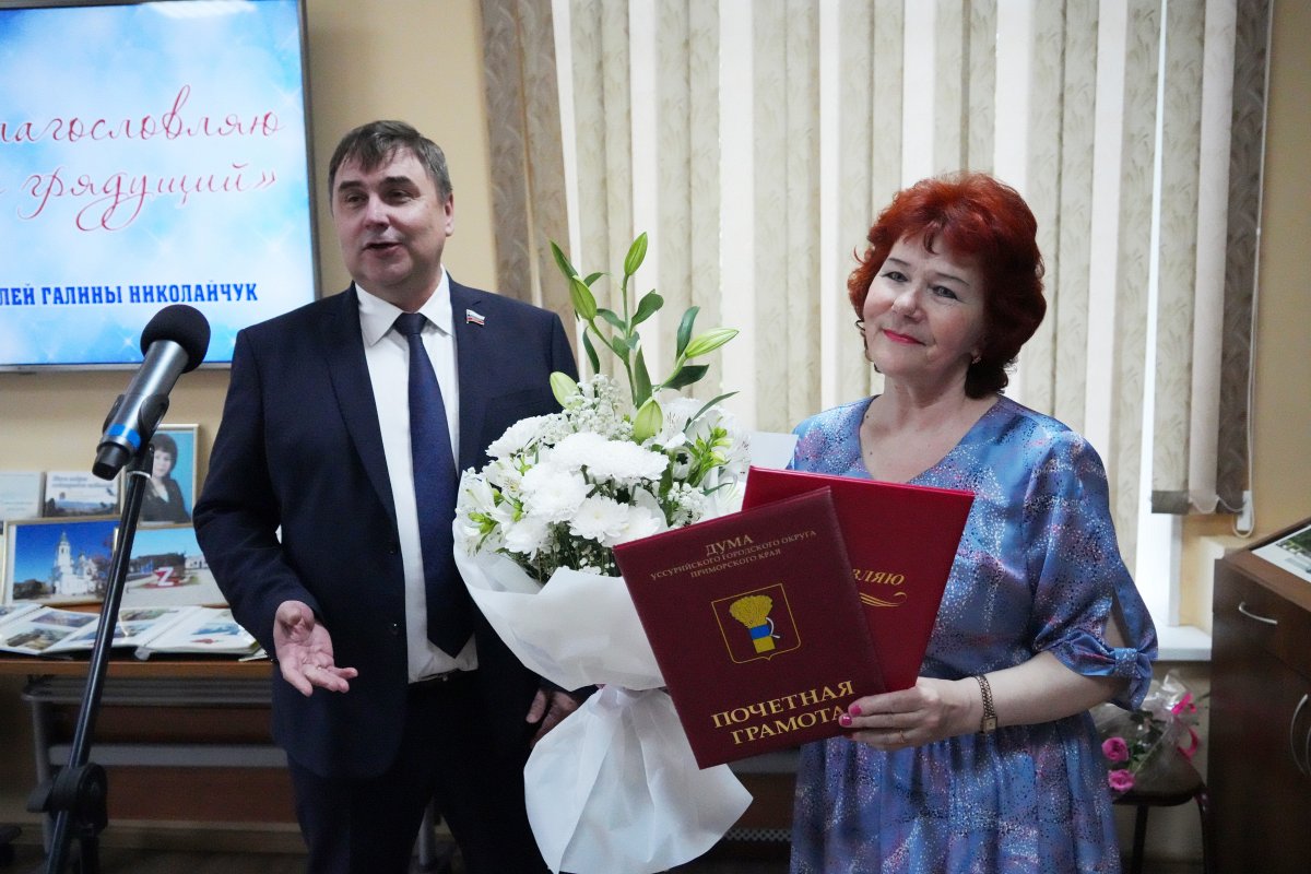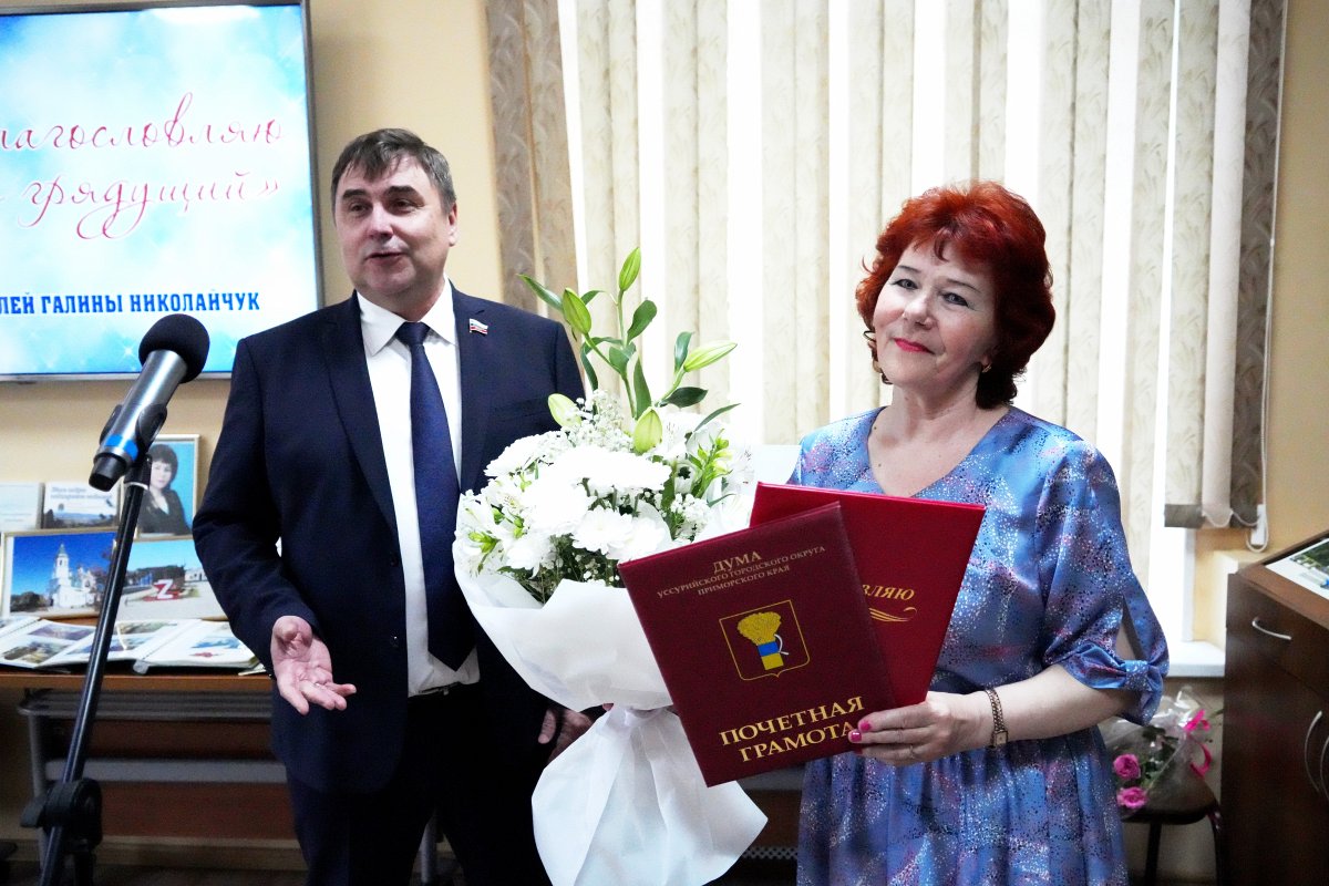 Поздравить Галину Николаевну и вручить ей за активную творческую деятельность и вклад в развитие культуры и искусства на территории Уссурийского городского округа Почетную грамоту Думы и памятный адрес пришел председатель Думы Уссурийского городского округа Приморского края Александр Черныш.