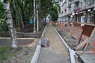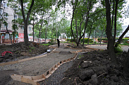 На данный момент окончены земельные работы и произведено уплотнение основания. В настоящее время подрядчик осуществляет установку опалубки для последующей заливки бетоном пешеходных дорожек. Кроме того, завершен монтаж закладных элементов и проложены кабельные линии для проведения системы освещения.