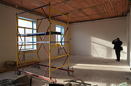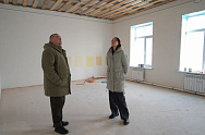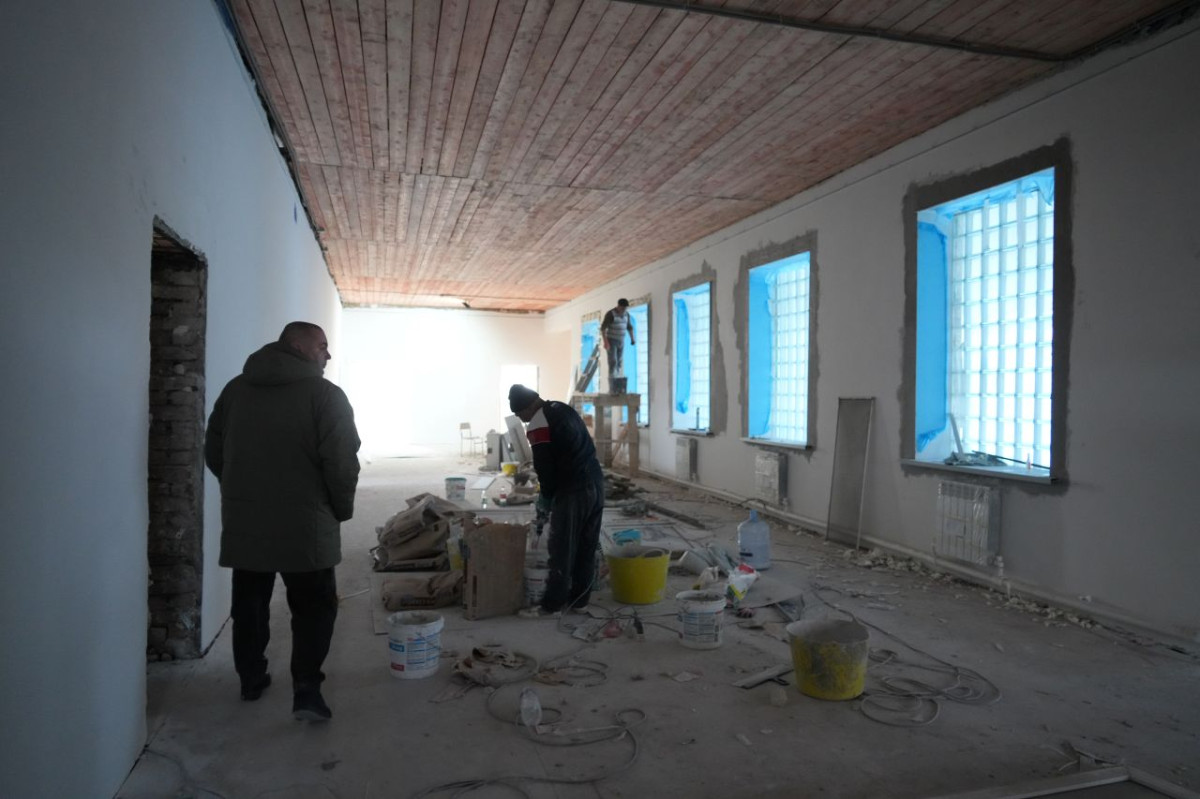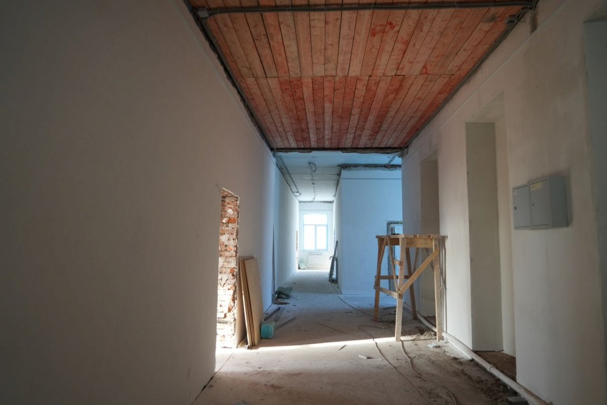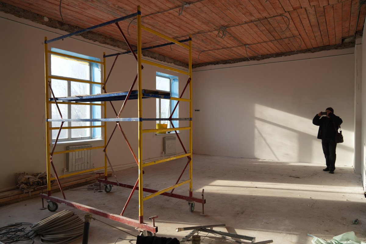 Ремонт в здании школы ведется параллельно. В рекреациях и кабинетах завершается установка систем отопления, проводится монтаж электрики, укладка плитки и оштукатуривание стен.