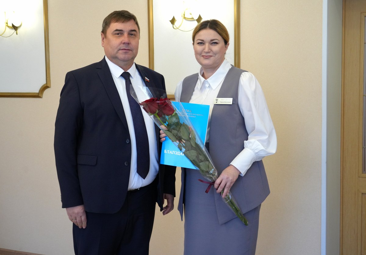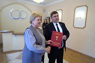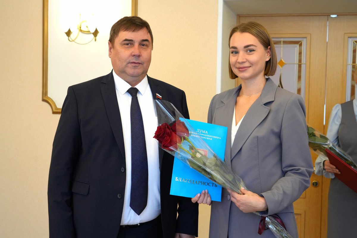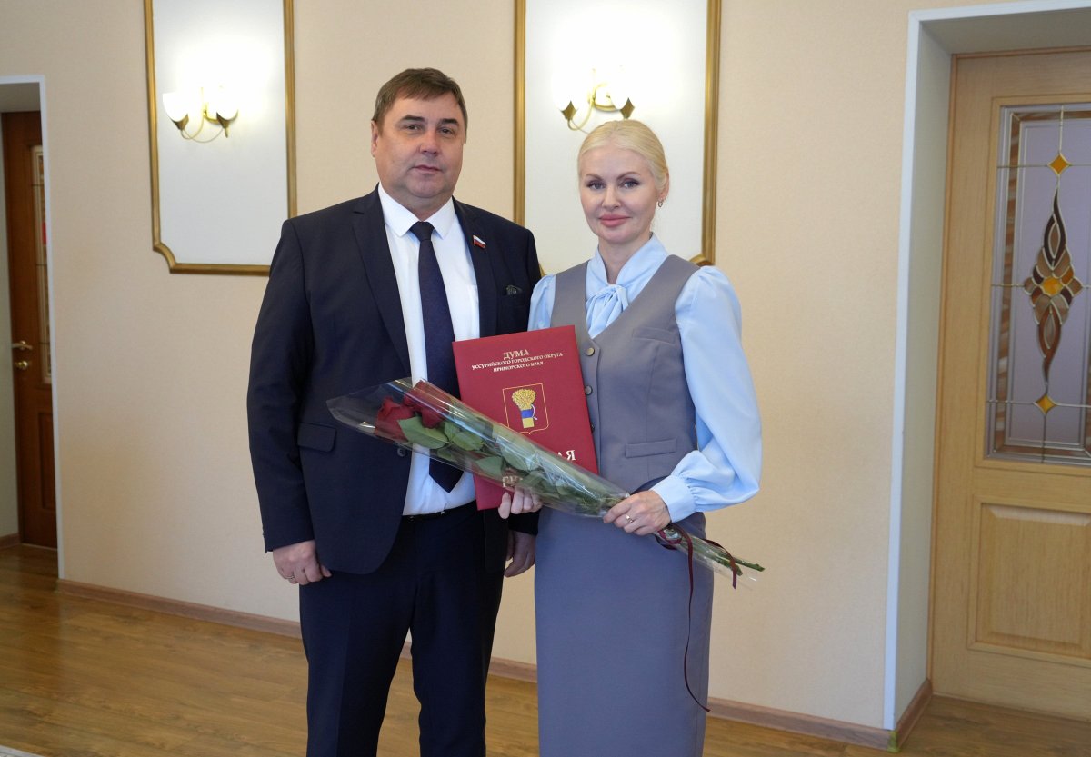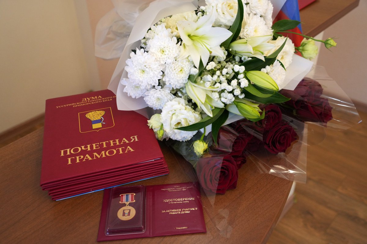 Особо отличившихся в работе сотрудников председатель Думы наградил Благодарностями и Почетными грамотами Думы. Начальнику управления ЗАГС Уссурийска Марине Сердюк был вручен Почетный знак Думы УГО ПК «За активное участие в работе Думы».